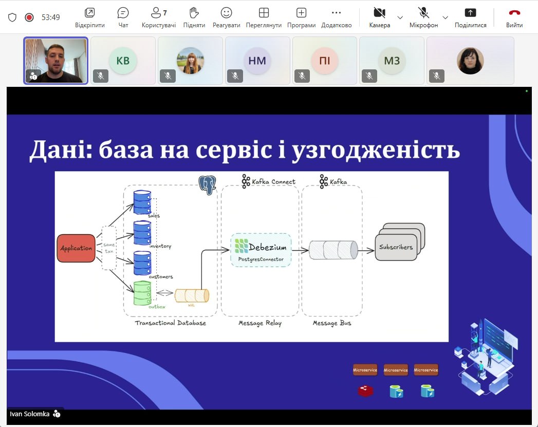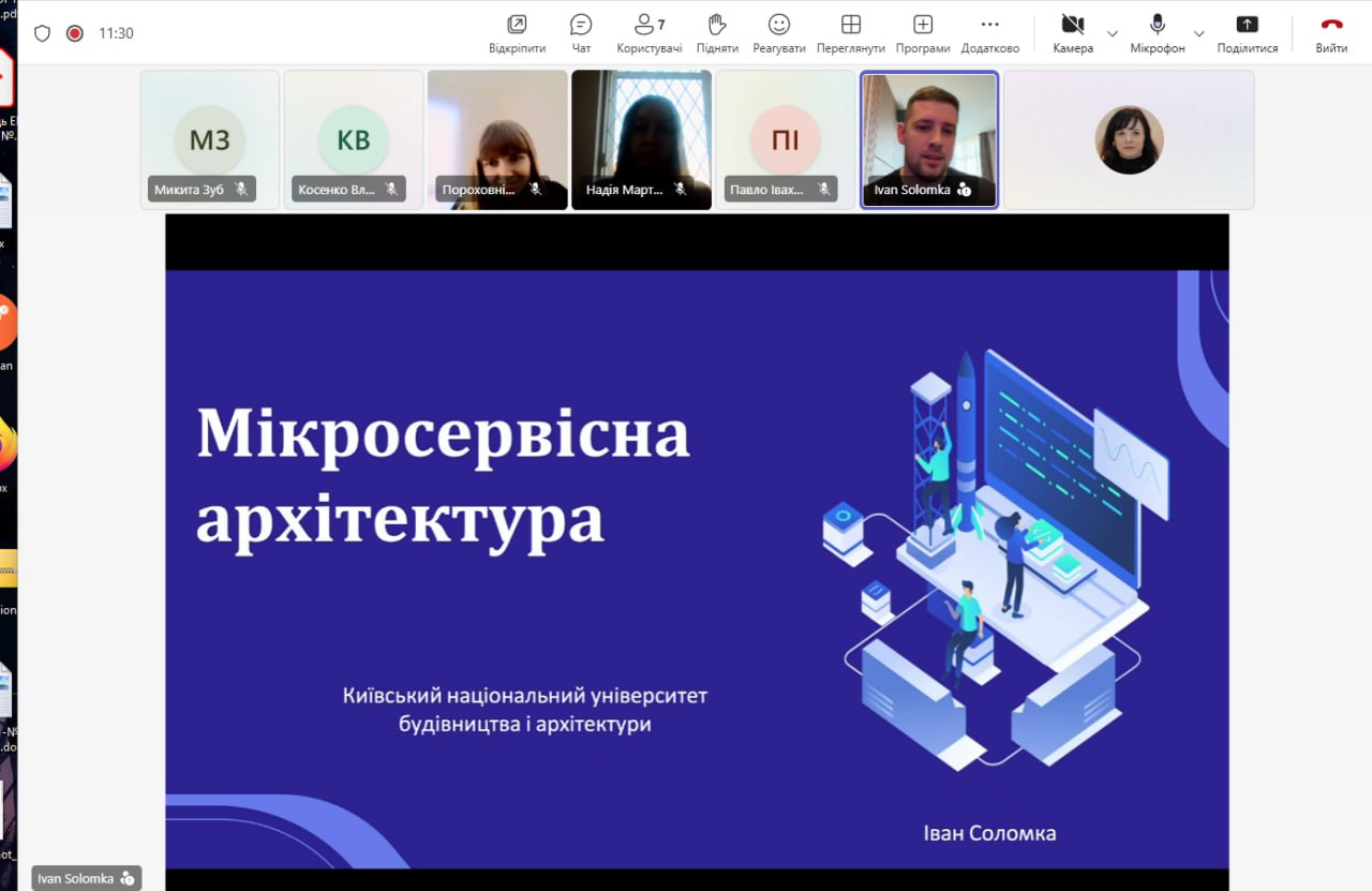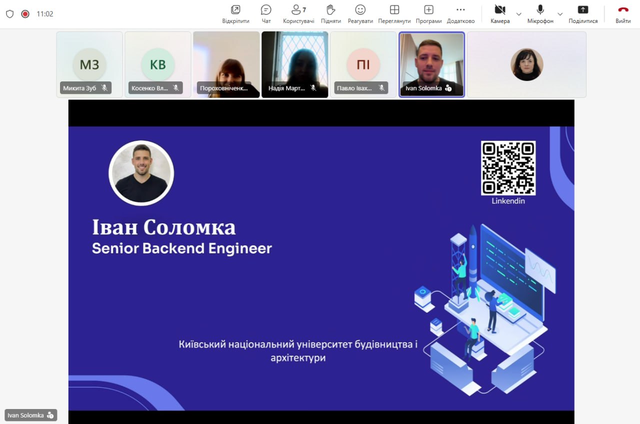 З листопада 2025 р., наш випускник Іван Соломка, випускник факультету автоматизації та інформаційних технологій КНУБА, Senior Software Engineer у компанії iDeals із досвідом у розподілених високонавантажених системах, мікросервісній архітектурі, хмарних рішеннях та доменах SmartTender/Prozorro, Health Care, Payments, M&A і Real Estate, ветеран російсько-української війни, який закінчив бакалаврат та магістратуру за спеціальністю “Комп’ютерні науки”, був залучений до проведення лекції “Мікросервісна архітектура” для груп КНм-25 та ІПЗм-25.