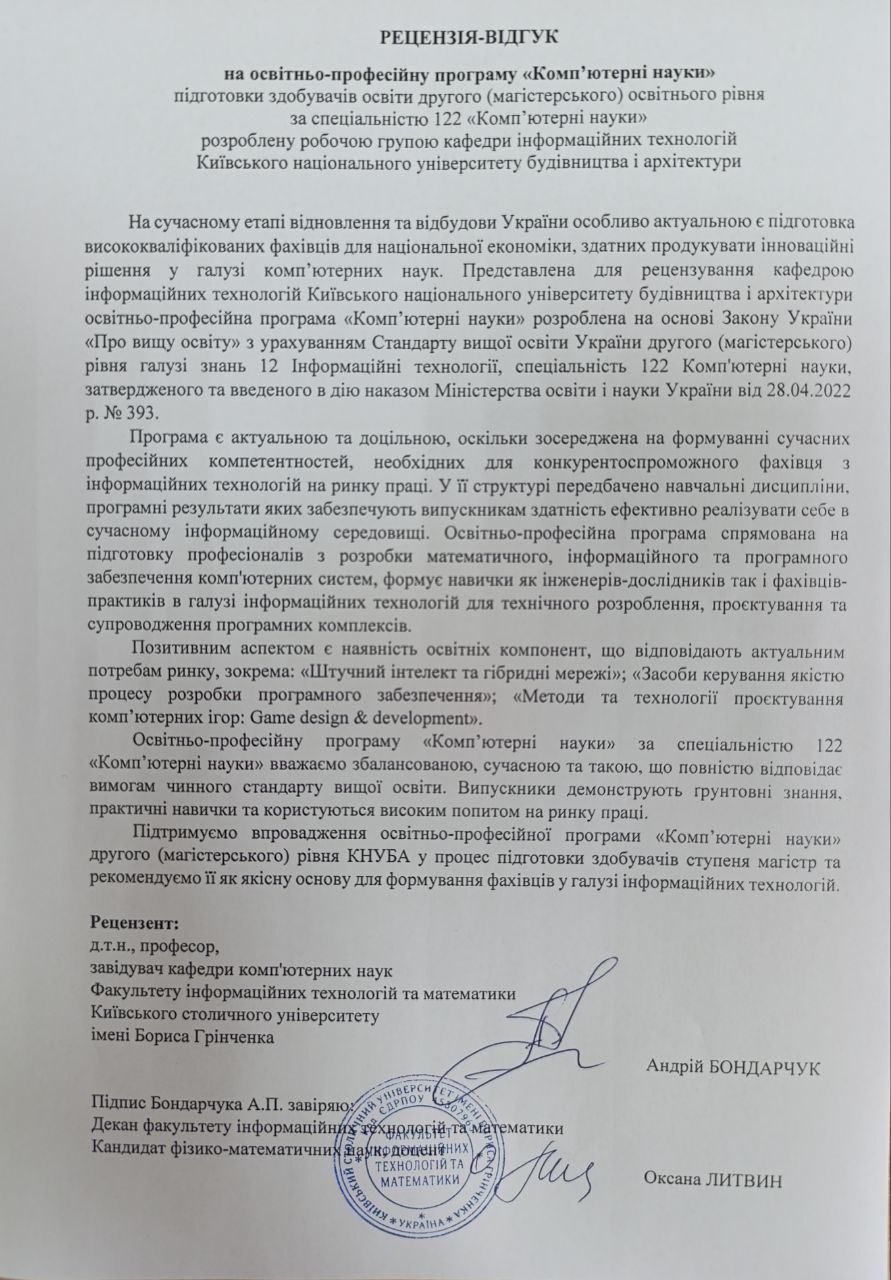 РЕЦЕНЗІЯ-ВІДГУК КCУ ім. Бориса Грінченка на освітньо-професійну програму «Комп’ютерні науки» другого (магістерського) рівня вищої освіти спеціальності 122 «Комп’ютерні науки»