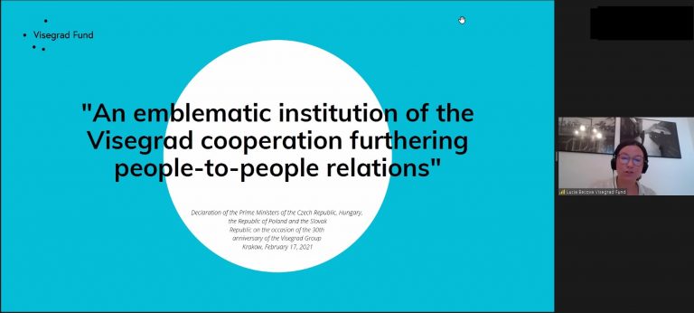 11 червня відбувся заключний день Форуму Міжнародних можливостей КНУБА, участь у якому в режимі відеоконференції взяла PR менеджер Міжнародного Вишеградського фонду – Люсія Бецова, презентувавши Міжнародний Вишеградський фонд як одну із можливостей налагодження партнерських зв’язків та розширення міжнародної співпраці.