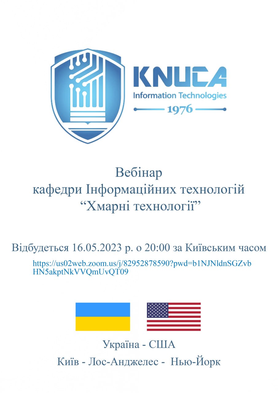 Вебінар “Хмарні технології” Вебінар кафедри Інформаційних технологій “Хмарні технології”Відбудеться 16.05.2023 р. о 20:00 за Київським часом.Посилання: https://us02web.zoom.us/j/82952878590?pwd=b1NJNldnSGZvbHN5akptNkVVQmUvQT09