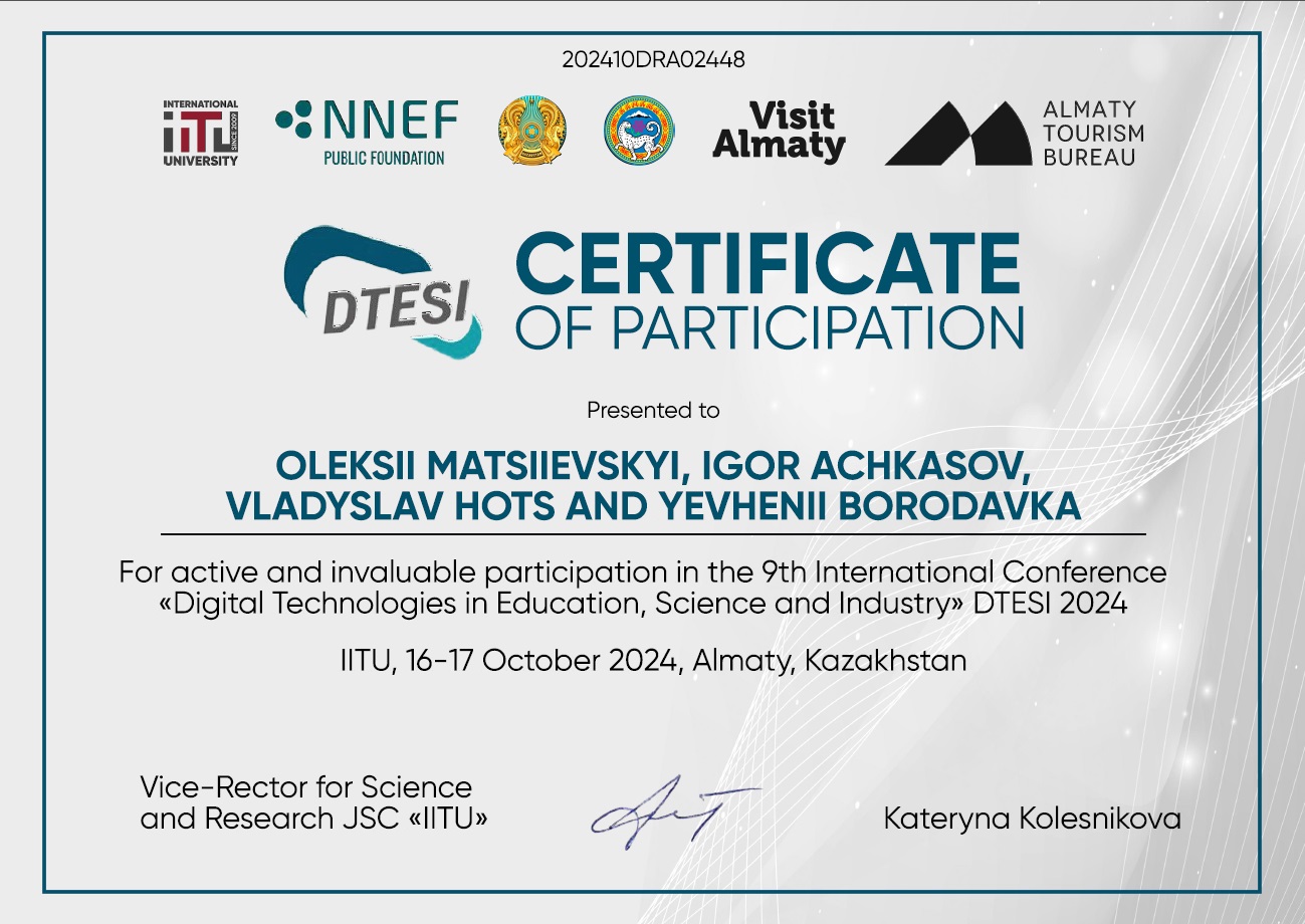 - S. Dolhopolov, T. Honcharenko, S. Dolhopolova, O. Riabchun and M. Delembovskyi “Use of Artificial Intelligence Systems for Determining the Career Guidance of Future University Student”, in SIST 2022, 2022 International Conference on Smart Information Systems and Technologies, Nur-Sultan Kazakhstan, 28-30 April 2022, DOI: 10.1109/SIST54437.2022.9945752 (SCOPUS)
