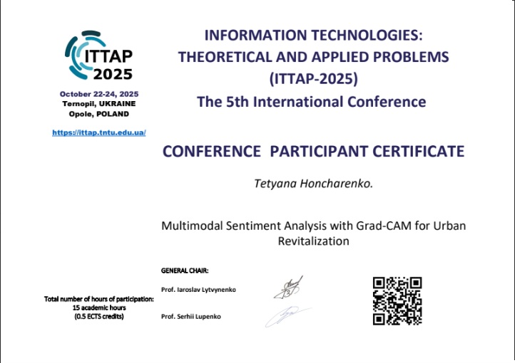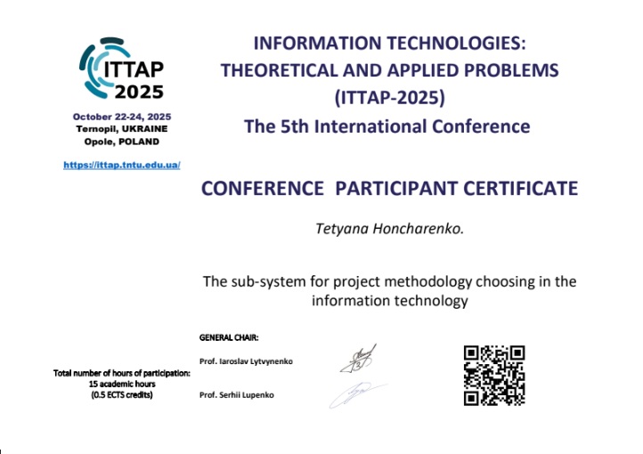 • Кандидат технічних наук, 05.13.06 Інформаційні технології, тема дисертації: «Моделі, методи та інформаційна технологія побудови поверхні території під забудову», 2019 р.
