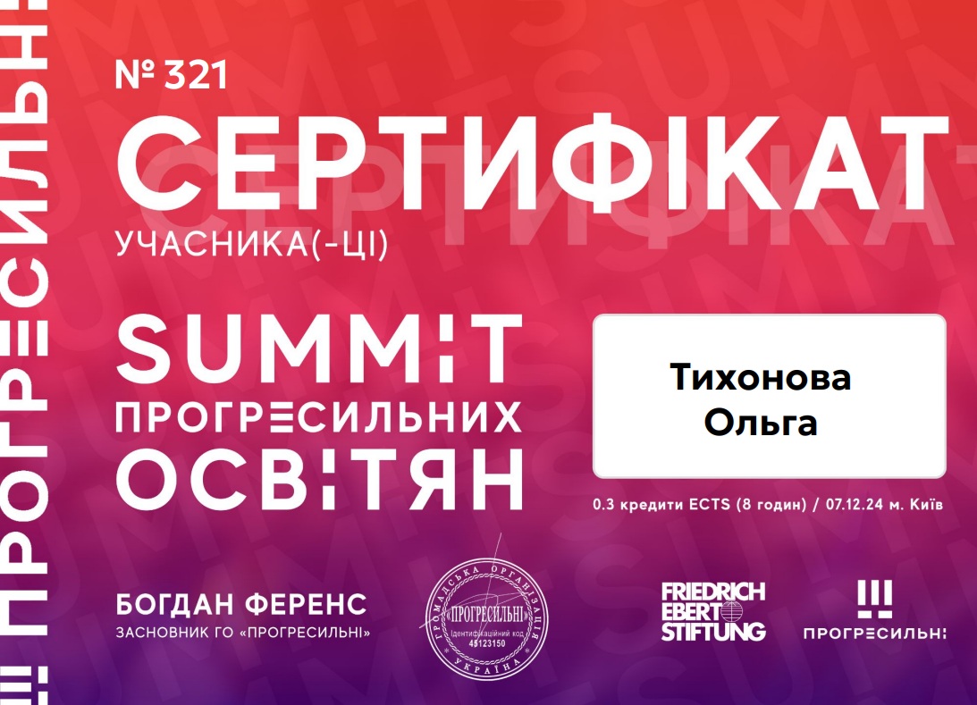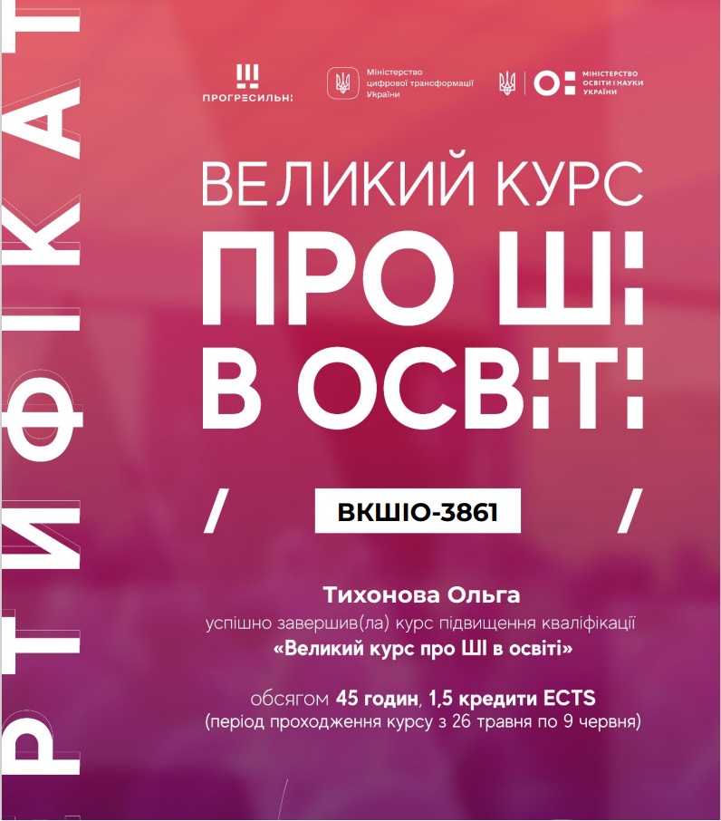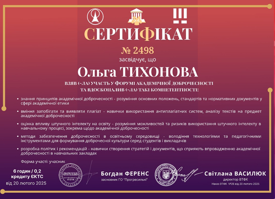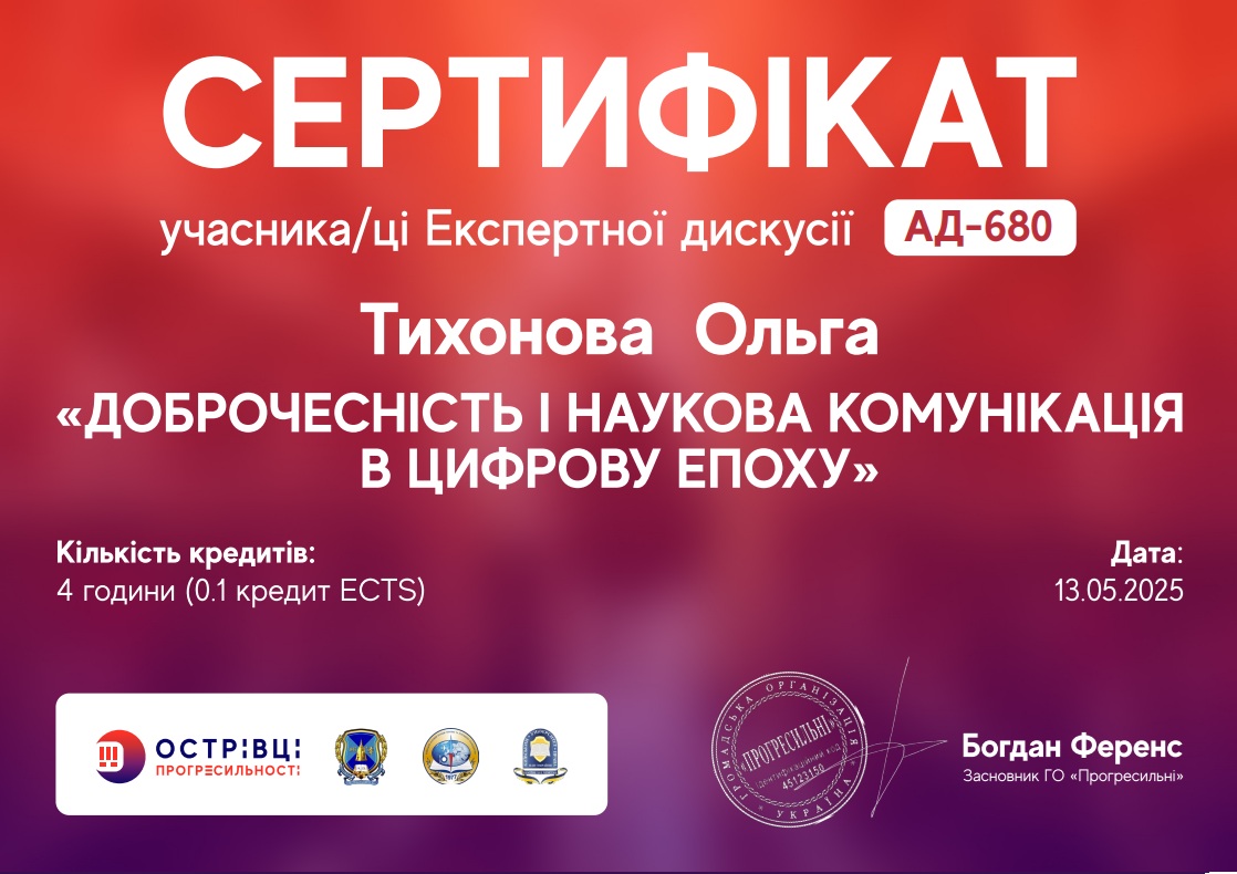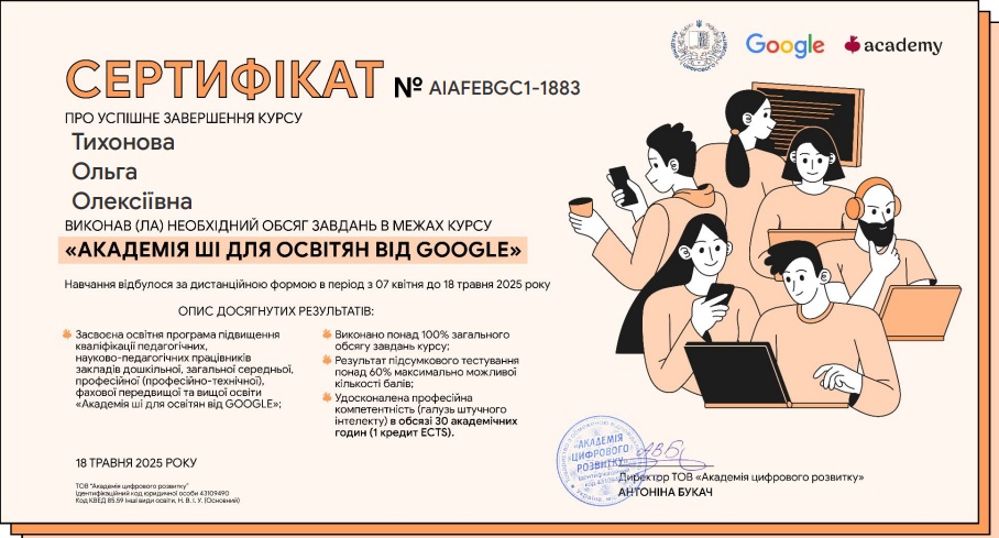 - ТОВ “АКАДЕМІЯ ЦИФРОВОГО РОЗВИТКУ”, cертифікати “Цифрові інструменти Google для освіти” № GDTfE-06-Б-02278 від 15.01.23, 30 годин (1 кредит ЕСТS), №GDTfE-06-С-00764 від 22.01.23, 15 годин (0,5 кредитів ЕСТS).