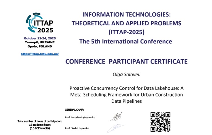 - Solovei, O., Honcharenko, T. (2025). Leveraging Sensitivity Analysis for Configurable Kafka Clusters: A Multi-Objective Model to Minimize Latency. ICCSEEA2025: The 8th International Conference on Computer Science, Engineering and Education Applications, June 21 – June 22 , 2025 , Lviv, Ukraine, https://www.mecs-press.org/ijisa/ijisa-v17-n4/IJISA-V17-N4-3.pdf (Scopus)