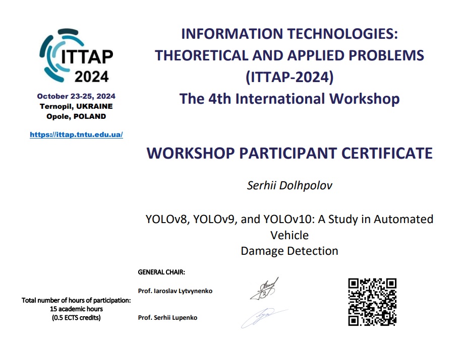 - Serhii Dolhpolov, Tetyana Honcharenko, Denys Chernyshev, Olena Panina and Antonina Makhynia. Advancing Automated Quality Control in Automotive Manufacturing: A Comparative Analysis of YOLOv8, YOLOv9, and YOLOv10 for Vehicle Damage Detection. 9th International Conference Digital Technologies in Education, Science and Industry (DTESI-2024) October 16-17, 2024, Almaty https://dtesi.iitu.edu.kz/DTESI%202024%20Program.pdf