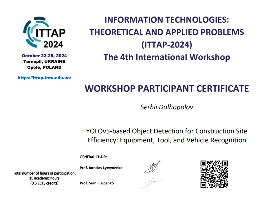 - Serhii Dolhpolov, Tetyana Honcharenko, Igor Achkasov and Vladyslav Hots. Optimizing Construction Site Management through YOLOv5-Based Object Detection: A Comprehensive Analysis of Resource Utilization and Safety Enhancement. 9th International Conference Digital Technologies in Education, Science and Industry (DTESI-2024) October 16-17, 2024, Almaty (Scopus) https://dtesi.iitu.edu.kz/DTESI%202024%20Program.pdf