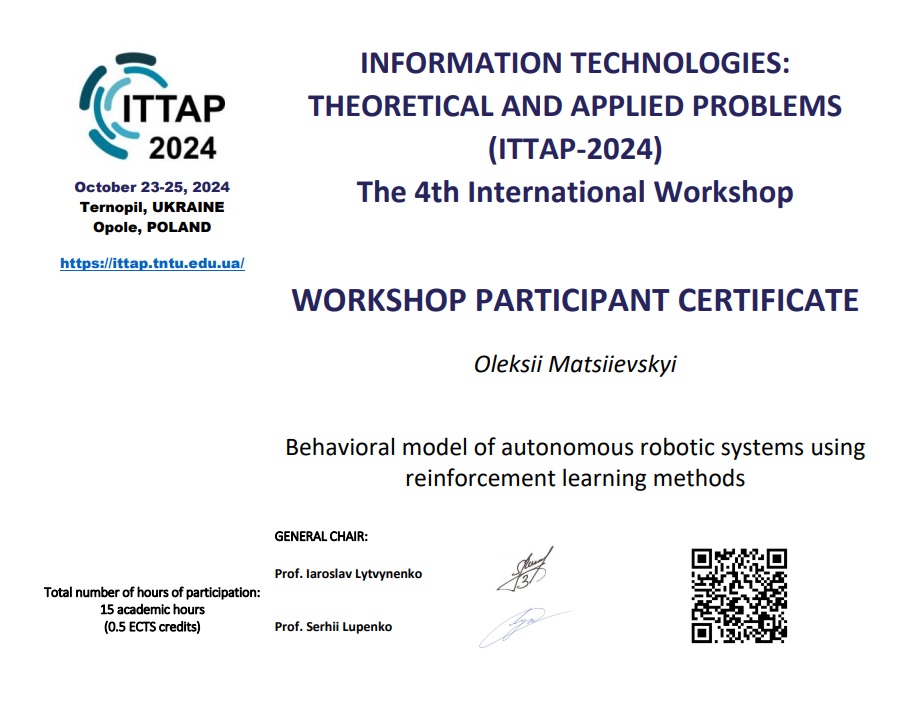 - Matsiievskyi, O., Achkasov, I., Borodavka, Y., Mazurenko, R. Behavioral model of autonomous robotic systems using reinforcement learning methods (2024) CEUR Workshop Proceedings, 3896, pp. 560-568. https://ceur-ws.org/Vol-3896/short14.pdf (Scopus)