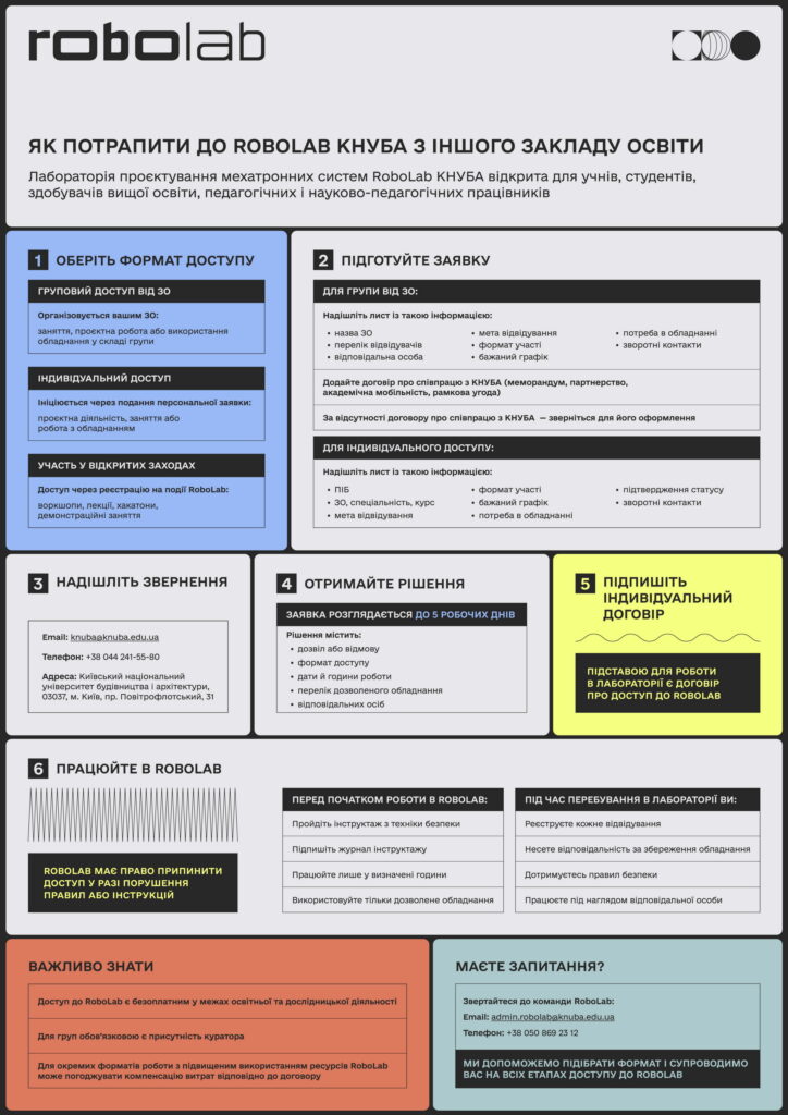 Відвідування лабораторії відбувається відповідно до регламенту роботи RoboLab та узгодженого графіка доступу.